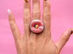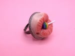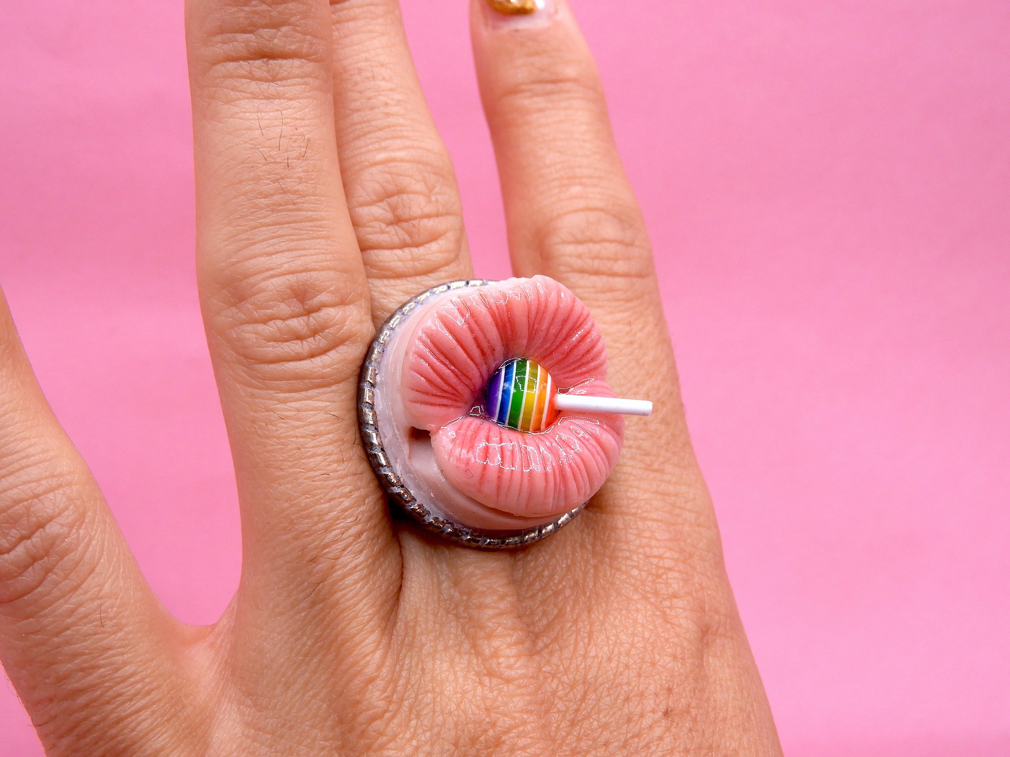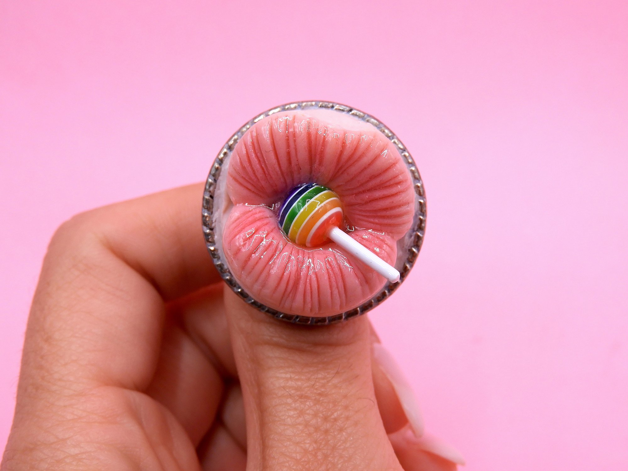 A whimsical pop surreal ring featuring a mouth with a Chupa Chups lollipop. Handmade polymer clay jewelry, perfect as a unique gift or quirky accessory.