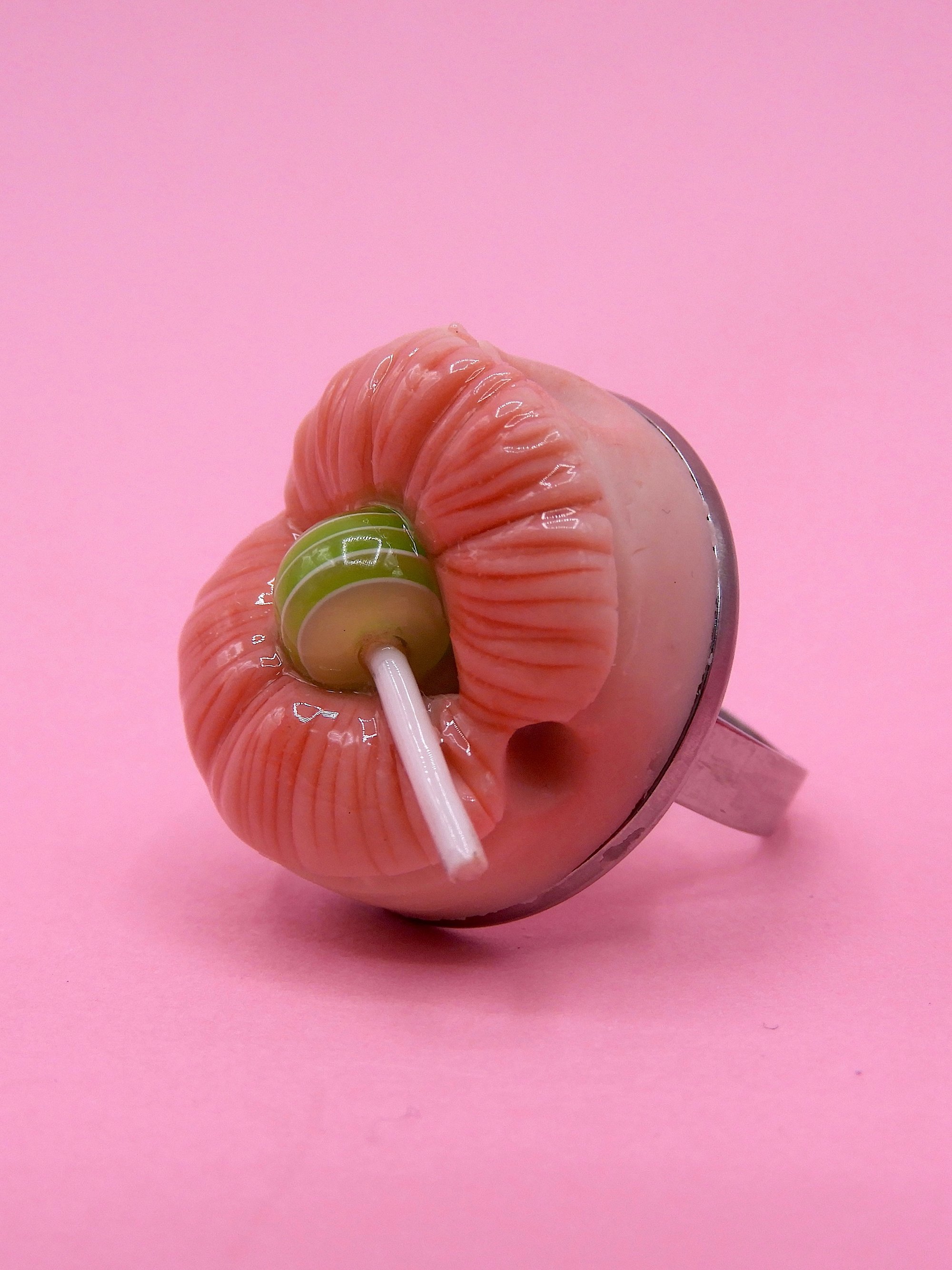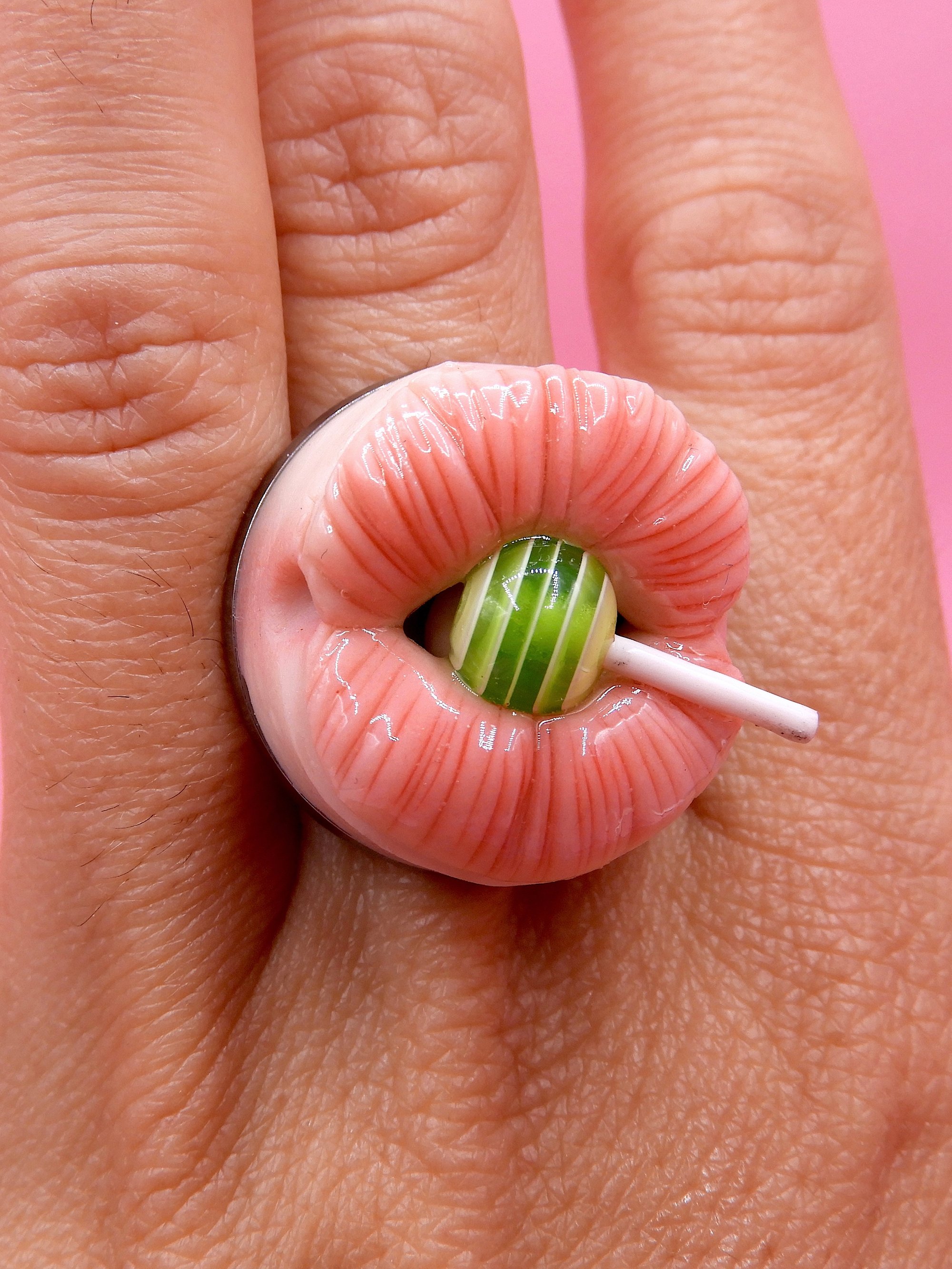 A whimsical pop surreal ring featuring a mouth with a Chupa Chups lollipop. Handmade polymer clay jewelry, perfect as a unique gift or quirky accessory.